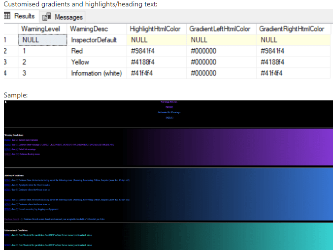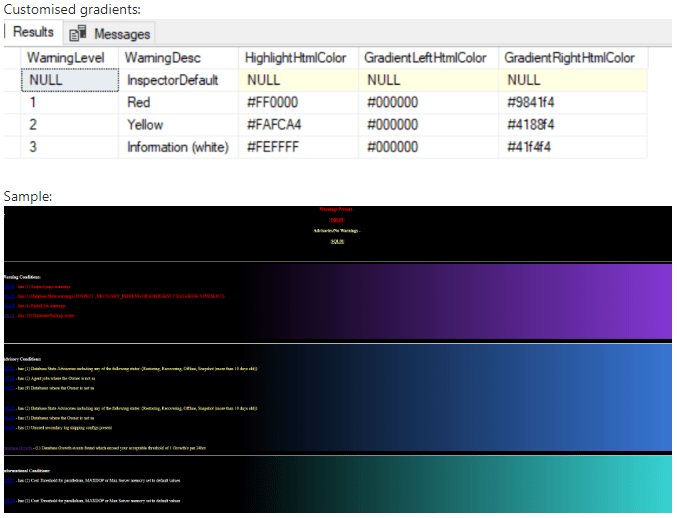 To change the Warning, Advisory and Info header colours including the highlighting colours for the tables you can set what ever hex colour you like in the Inspector.ModuleWarnings table, the colours can be reset back to default by executing Inspector.ResetHtmlColors
