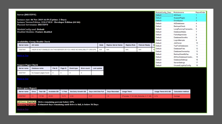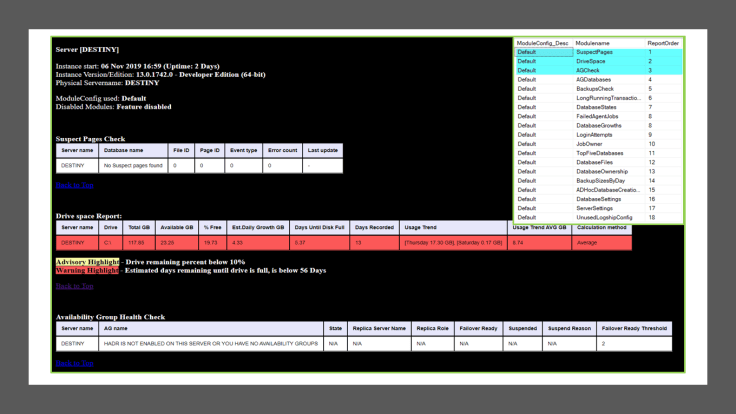 Report order is split into two sections , Server specific and non server specific. Server specific modules will report within their respective server section and show only that servers’ information whereas non server specific will be one table that contains all Servers’ information – these tables are situated at the very end of the report e.g Database Growths.