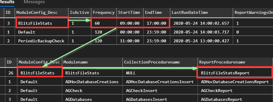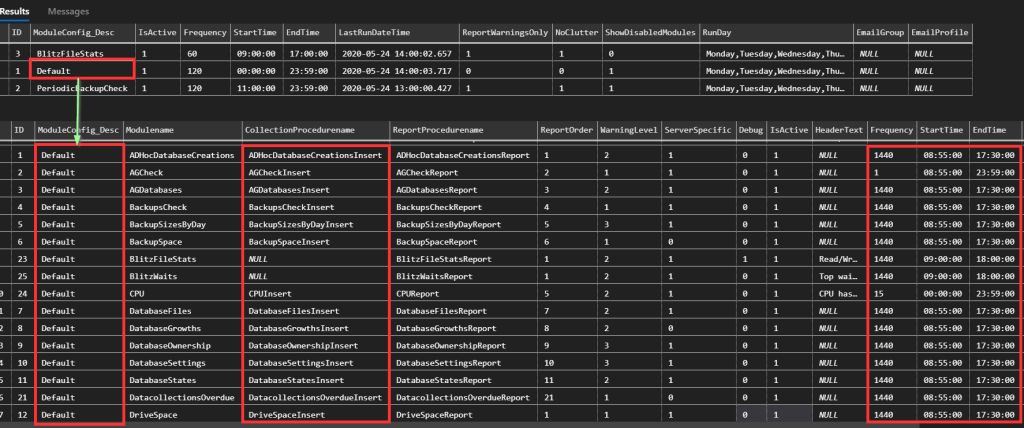Module Reports: For Reports these can be found in [Inspector].[ModuleConfig] i.e Inspector.ModuleConfig where IsActive = 1 and the frequency,StartTime and EndTime, however the modules which are subscribed to that report (to be included) are found in the Modules table (ReportProcedurename NOT NULL AND IsActive = 1)