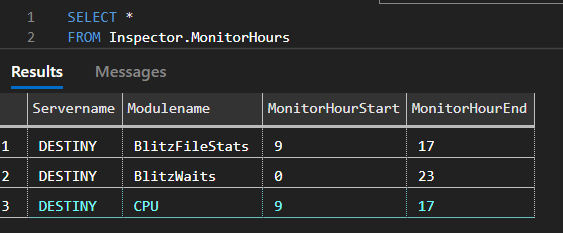 - Insert a row into Inspector.Modules with the relevant details – CollectionProcedurename = your collection proc name , set ReportProcedurename to your report proc name , setting the Frequency , Warninglevel, StartTime and EndTime and remaining columns accordingly (StartTime and EndTime in the Modules table applies only to the collection proc)